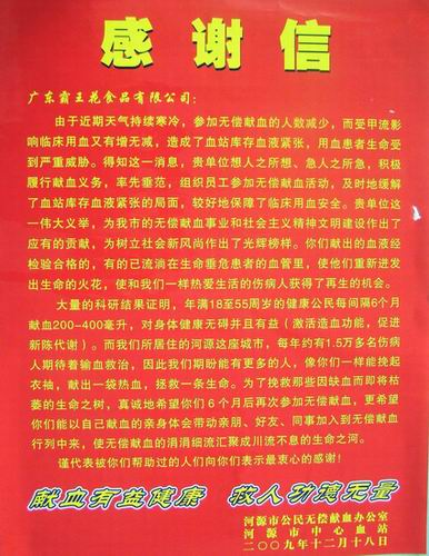 12月20日,我司員工積極到我市中心血站挽起衣袖踴躍參加無償獻血。昨日血站工作人員為我司送來了錦旗和感謝信。